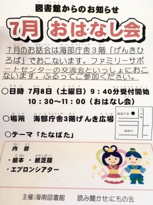 イベントを検索 当日 イベント (2017年 7月8日(土)) › イベント 日付ナビゲーション « 前の日 次の日 » 10:30 7月おはなし会 2017年 7月8日(土) @ 10:30 - 23:00 海陽町役場海部庁舎3階げんき広場, 海陽町奥浦 Japan 7月のおはなし会はファミリーサポートセンターの交流会と一緒に行います。場所がいつもと違うので注意してね。 さらに詳しく » + Export Events