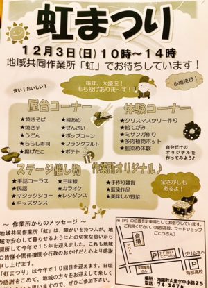イベントを検索 当日 イベント (2017年 12月3日(日)) › イベント 日付ナビゲーション « 前の日 次の日 » 10:00 虹まつり 2017年 12月3日(日) @ 10:00 - 14:00 虹作業所, 海陽町大里字中小路25 Japan 地域共同作業所「虹」でおまちしています! さらに詳しく » + Export Events
