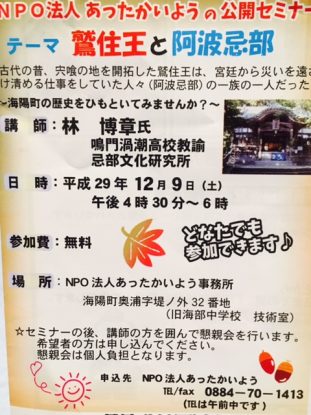 イベントを検索 当日 イベント (2017年 12月9日(土)) › イベント 日付ナビゲーション « 前の日 次の日 » 16:30 鷲住王と阿波忌部 林博章先生公開セミナー 2017年 12月9日(土) @ 16:30 - 18:00 あったかいよう, 徳島県海部郡海陽町奥浦字堤ノ外32 Japan 古代の昔、宍喰の地を開拓した鷲住王は、宮廷から災いを遠ざけ清める仕事をしていた人々(阿波忌部)の一族の一人だっ... さらに詳しく » + Export Events