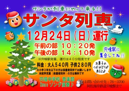 イベントを検索 当日 イベント (2017年 12月24日(日)) › イベント 日付ナビゲーション « 前の日 次の日 » 開催中 ¥300 巨大!つながるブロックのまち 2017年 12月16日(土) @ 09:00 - 2018年 1月31日(水) @ 17:00 海洋自然博物館マリンジャム, Japan 今年の冬はマリンジャムで! チームラボ、阿佐東線25周年を記念して、徳島県南部にある海洋自然博物館「マリンジャ... さらに詳しく » 10:20 ¥280 - ¥540 サンタ列車 2017年 12月24日(日) @ 10:20 - 14:50 宍喰駅, 徳島県海部郡海陽町久保字松本 Japan サンタが阿佐鉄にやって来る★午前10:20宍喰駅発と午後2:10宍喰駅発の列車だけ!!みんな集まれ~(≧∀≦) さらに詳しく » 13:00 まぜのおかクリスマス会2017 2017年 12月24日(日) @ 13:00 - 18:00 まぜのおかオートキャンプ場, 徳島県海部郡海陽町浅川西福良43 ツリー飾りつけに逃走中、スペシャルライブにじゃんけん大会★みんなでクリスマスを楽しも~♪ さらに詳しく » + Export Events