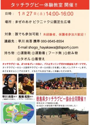 イベントを検索 当日 イベント (2018年 1月27日(土)) › イベント 日付ナビゲーション « 前の日 次の日 » 開催中 ¥300 巨大!つながるブロックのまち 2017年 12月16日(土) @ 09:00 - 2018年 1月31日(水) @ 17:00 海洋自然博物館マリンジャム, Japan 今年の冬はマリンジャムで! チームラボ、阿佐東線25周年を記念して、徳島県南部にある海洋自然博物館「マリンジャ... さらに詳しく » ¥200 IN MY HOUSE 2018年 1月12日(金) @ 12:00 - 2018年 5月28日(月) @ 17:00 タニのいえ, 海部郡海陽町大里馬谷3 Japan 10歳以下と80歳以上が撮るインスタにはあがらない日常写真展 1/12~5/28 開館日 月・金・土 12:0... さらに詳しく » 09:30 ¥200 1月びっくり箱「海ごみ問題を一緒にかんがえよう!」 2018年 1月27日(土) @ 09:30 - 14:00 鞆浦漁協, 徳島県海部郡海陽町大里 Japan 徳島の海ってすごくキレイなんじょ! 4K映像で徳島の海の美しさを実感し、海岸漂着ごみの問題について考えます。 ... さらに詳しく » 14:00 タッチラグビー体験教室開催! 2018年 1月27日(土) @ 14:00 - 16:00 まぜのおかピクニック公園芝生広場, Japan タッチラグビーはぶつかるプレーのない、パスとランニングだけの安全なスポーツです。 タッチラグビーのルール説明や... さらに詳しく » + Export Events