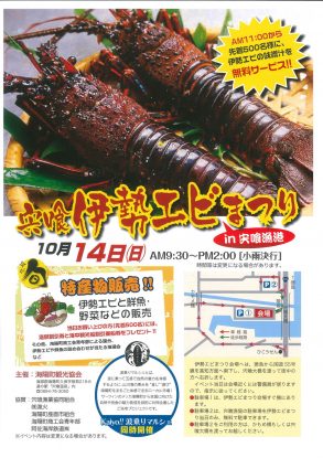 イベントを検索 当日 イベント (2018年 10月14日(日)) › イベント 日付ナビゲーション « 前の日 次の日 » 09:30 宍喰伊勢エビまつり 2018年 10月14日(日) @ 09:30 - 14:00 宍喰漁港周辺, 海陽町宍喰浦 Japan 今が旬の伊勢エビや地元の野菜や干物などなど販売します。伊勢エビ味噌汁を先着500名に無料配布も有りますよ♪ さらに詳しく » ¥500 駅からウォーク「歴史の道・土佐本道」宍喰駅~甲浦駅 2018年 10月14日(日) @ 09:30 - 14:00 宍喰駅, 徳島県海部郡海陽町久保字松本 Japan 歴史の道「土佐本道」の徳島と高知の県境を超えるウォーキング。宍喰の伊勢えび祭りに寄った後、古い峠道を越えて、甲... さらに詳しく » + Export Events