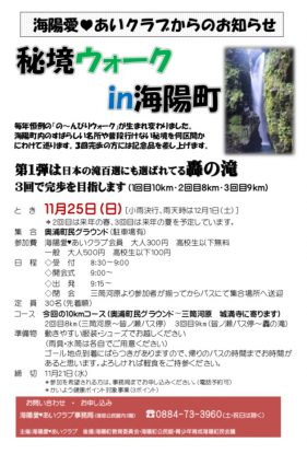イベントを検索 当日 イベント (2018年 11月25日(日)) › イベント 日付ナビゲーション « 前の日 次の日 » 終日 阿波の幕末刀 2018年 10月30日(火) - 2019年 1月27日(日) 海陽町立博物館, 海陽町四方原字杉谷73 Japan 幕末期に活躍をした刀工による作品が大集合。 展示作品:海部氏吉、吉川祐芳、長谷川吉廣、安芸一門、中島氏詮、横山... さらに詳しく » 08:30 ¥500 秘境ウォークin海陽町 第一弾轟の滝 2018年 11月25日(日) @ 08:30 - 12:00 奥浦町民グランド, 徳島県海部郡海陽町奥浦字堤ノ外32 海陽町内のすばらしい名所や普段行けない秘境を何区間かにわけて巡ります。 3回完歩の方には記念品も! 集合 奥浦... さらに詳しく » + Export Events
