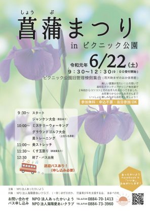 イベントを検索 当日 イベント (2019年 6月22日(土)) › イベント 日付ナビゲーション « 前の日 次の日 » 09:30 菖蒲まつり 2019年 6月22日(土) @ 09:30 - 12:30 まぜのおかピクニック公園芝生広場, Japan ピクニック公園で一緒に菖蒲を楽しみませんか? ミステリーウォーキング、グラウンドゴルフ、美トレなど 参加自由、... さらに詳しく » + Export Events