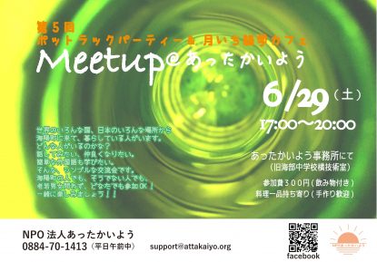 イベントを検索 当日 イベント (2019年 6月29日(土)) › イベント 日付ナビゲーション « 前の日 次の日 » 17:00 ¥300 第5回Meetup@あったかいよう 2019年 6月29日(土) @ 17:00 - 20:00 あったかいよう, 徳島県海部郡海陽町奥浦字堤ノ外32 Japan ポットラックパーティ&月いち語学カフェ お気軽に遊びに来てね! さらに詳しく » + Export Events