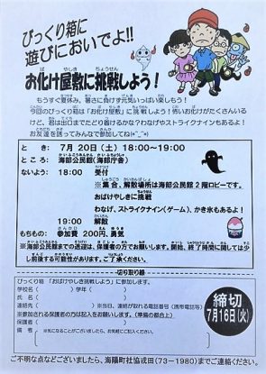 イベントを検索 当日 イベント (2019年 7月20日(土)) › イベント 日付ナビゲーション « 前の日 次の日 » 18:00 ¥200 7月のびっくり箱「お化け屋敷に挑戦!」 2019年 7月20日(土) @ 18:00 - 19:00 海部公民館, 海陽町奥浦字新町44 Japan もうすぐ夏休み! お化け屋敷で見も心も涼んじゃおう! 最後までたどり着いたら、ゲームとかき氷があるよ! さらに詳しく » + Export Events