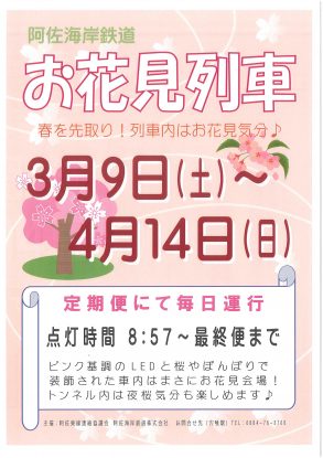 イベントを検索 当日 イベント (2019年 3月9日(土)) 日付ナビゲーション « 前の日 次の日 » 06:00 お花見列車 2019年 3月9日(土) @ 06:00 - 2019年 4月14日(日) @ 21:30 阿佐海岸鉄道, Japan 列車の中でお花見気分が楽しめますよ~♪ さらに詳しく » 12:30 DMV第1号 おひろめ 2019年 3月9日(土) @ 12:30 - 14:00 阿佐海岸鉄道 宍喰駅, 徳島県海部郡海陽町久保字松本34-2 Japan DMV第1号の“おひろめ”、デザイン入選者の表彰式など行われます。JR北海道の黄色いDMVも見納めですよ。 さらに詳しく » + Export Events